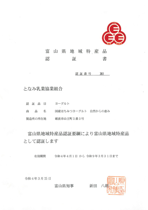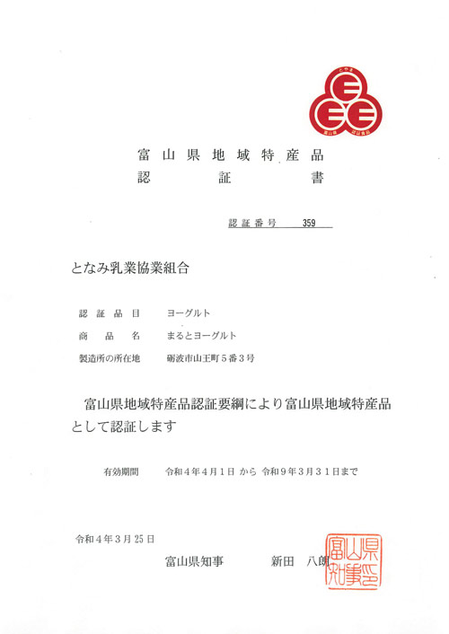 | 2022年(令和4年) | 富山県地域特産品認証![]() ![]() ![]() |