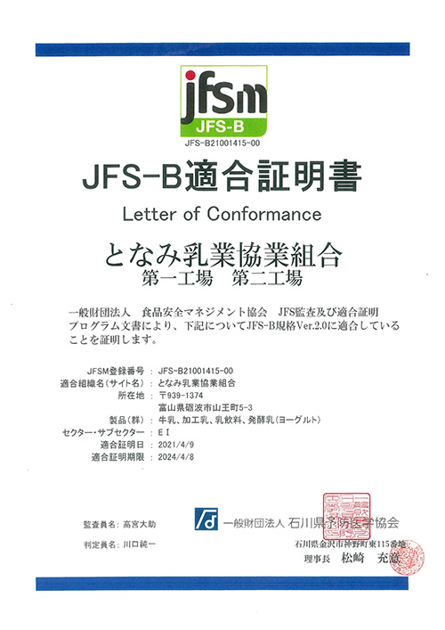 | 2021年(令和3年) | JFS-B規格 Var.2.0適合証明![]() |