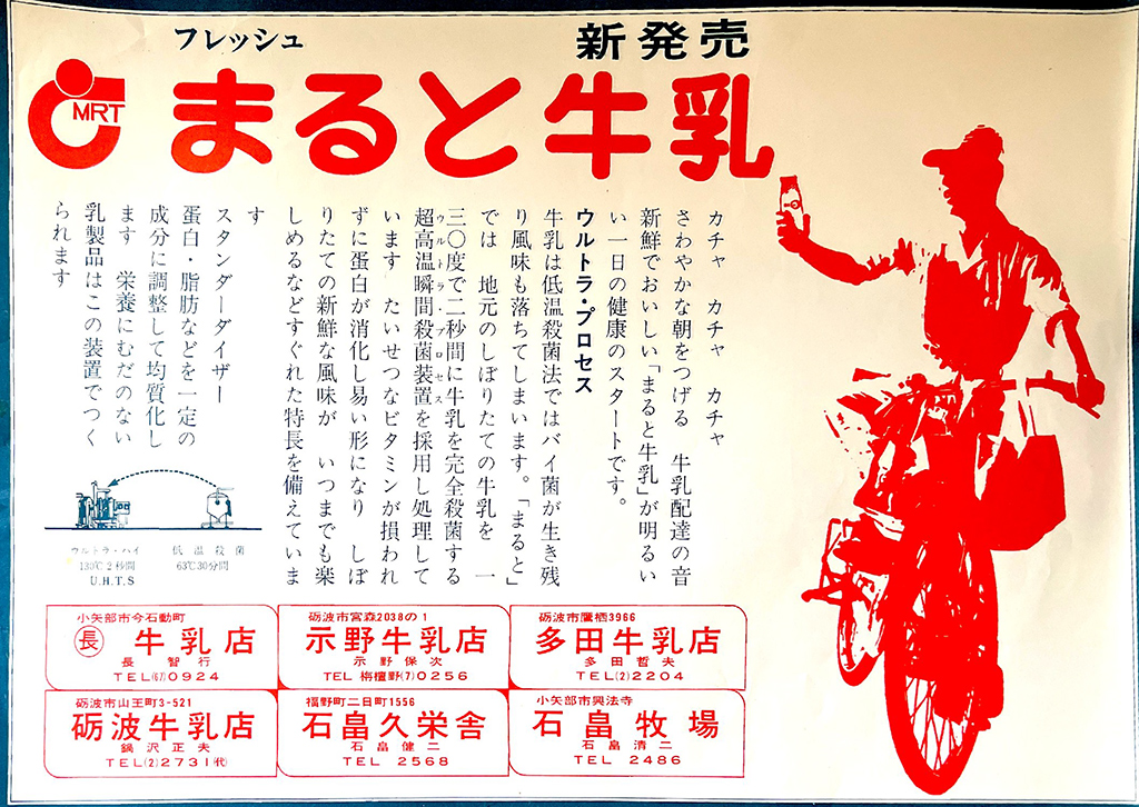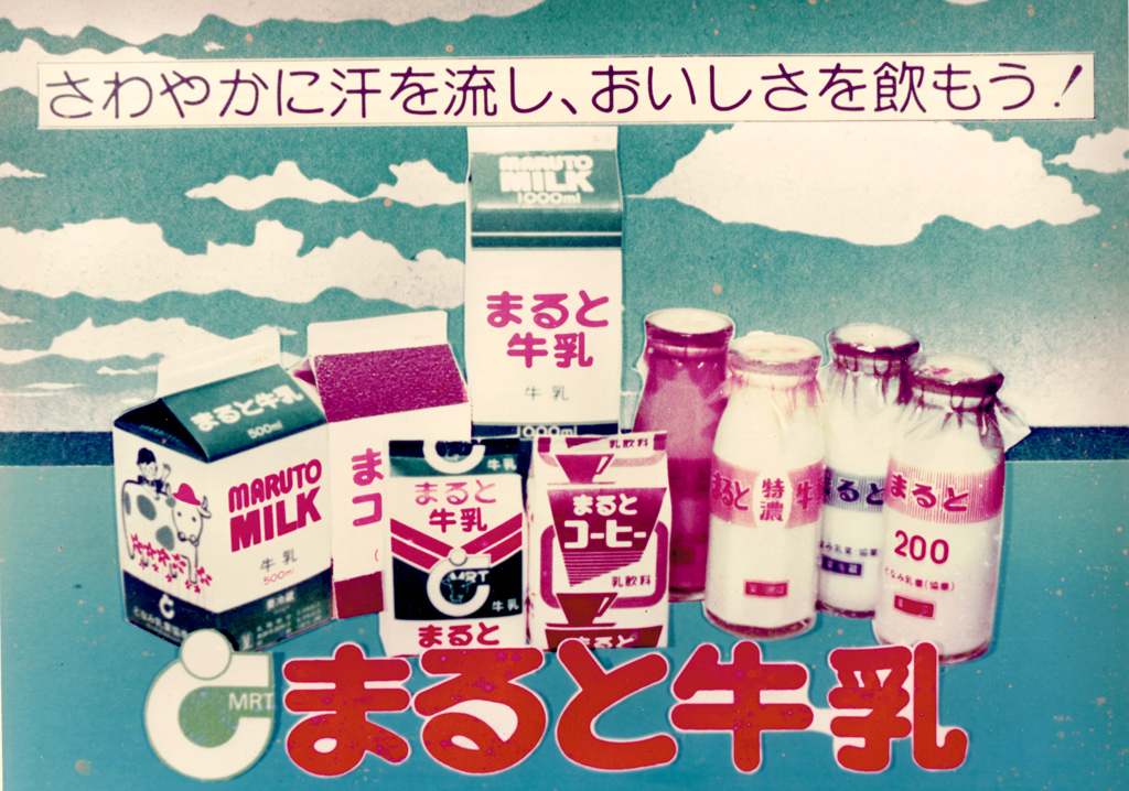 統一ブランド「まると牛乳」として生産開始。商品名「まると」は協業開始当時大手資本の牛乳メーカーが県内参入しはじめた頃で、砺波地区の業者同士が、手を取り合って協力し合いまるく収まって上手くいくようにとの思いが込められている。 |