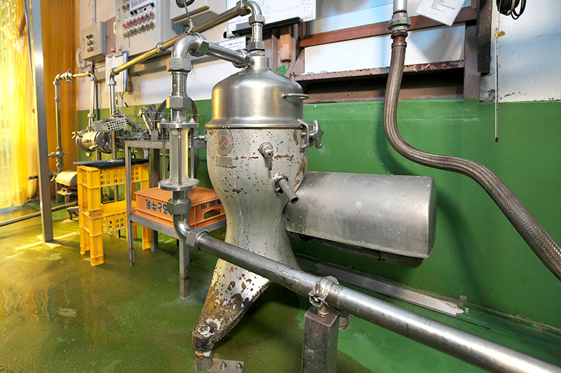 「クラリファイヤー」とよばれる機械を使い、生乳を高速回転させて、目に見えないくらいの小さなゴミや異物を分離して取り除きます。