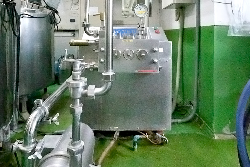 「ホモジナイザー」とよばれる処理を行い、脂肪球を細かく砕き小さく同じ大きさに揃えます。これを「均質化」といいます。牛乳の脂肪のつぶ(脂肪球)は、そのままだと脂肪球同士がくっつき合い、保存中に脂肪が浮いてきてしまうことを防ぐために行います。